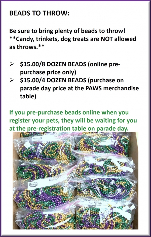 If you'd rather use Venmo for any of the above, send the total amount for registration, contests, shirts and/or beads to @PawsNela with a breakdown of how many pets you are registering, each of your pet's names, which contests you are registering them in, how many beads you are purchasing and/or the size shirt you would like. WE CAN'T PROCESS YOUR REGISTRATION UNLESS WE HAVE ALL OF THIS INFO. Please include your email address in case we have questions. You can also send an email to kreweofpaws@yahoo.com with those details.