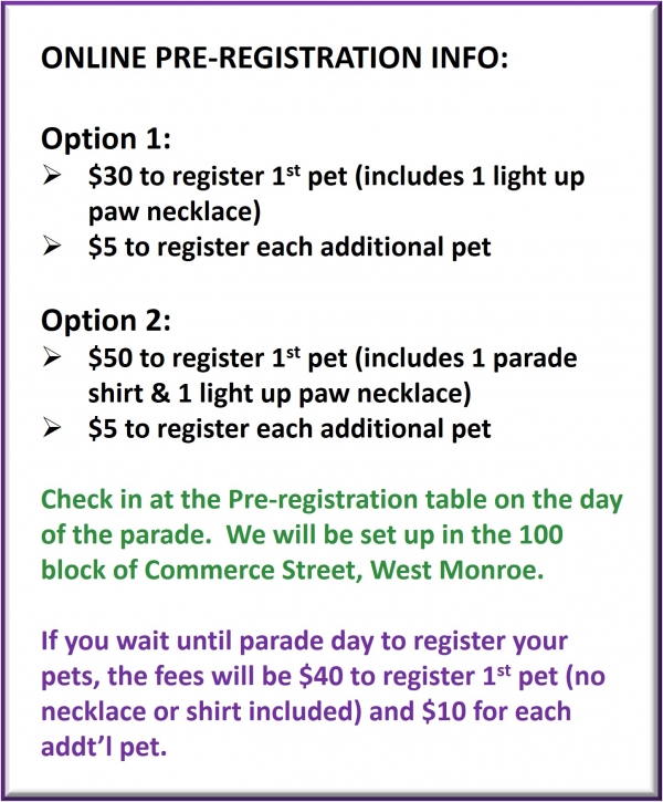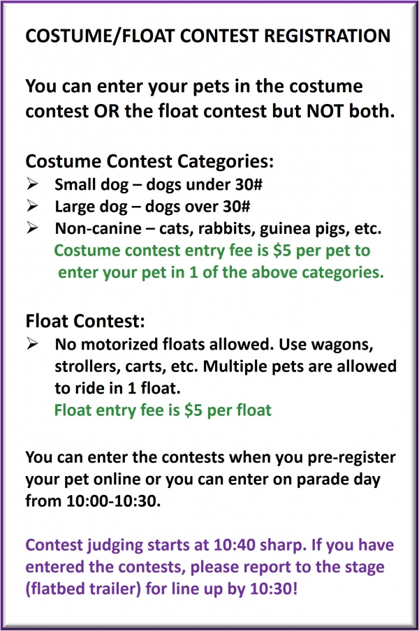 ⚜️ Register your pet(s) into the costume contest OR the float contest (using Paypal or a credit card).